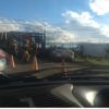 Caminhão carregado com estronca de eucalipto tomba e inviabiliza trafego na Rotatória da alça do anel viário na zona sul, Conquista.