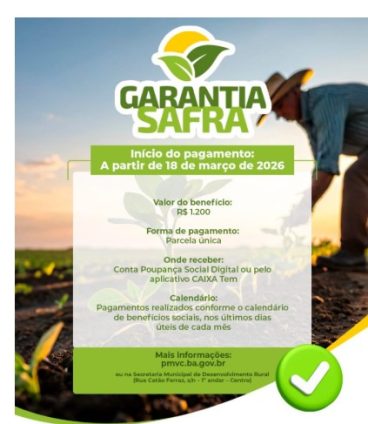 O pagamento do Garantia Safra funciona como um auxílio financeiro, pago em parcela única a agricultores familiares que perderam mais de 50% da produção devido à seca ou excesso de chuva. O valor é depositado via Caixa Econômica, em conta Poupança Social Digital ou Conta Caixa Tem, seguindo o calendário de benefícios sociais nos últimos dias úteis do mês.