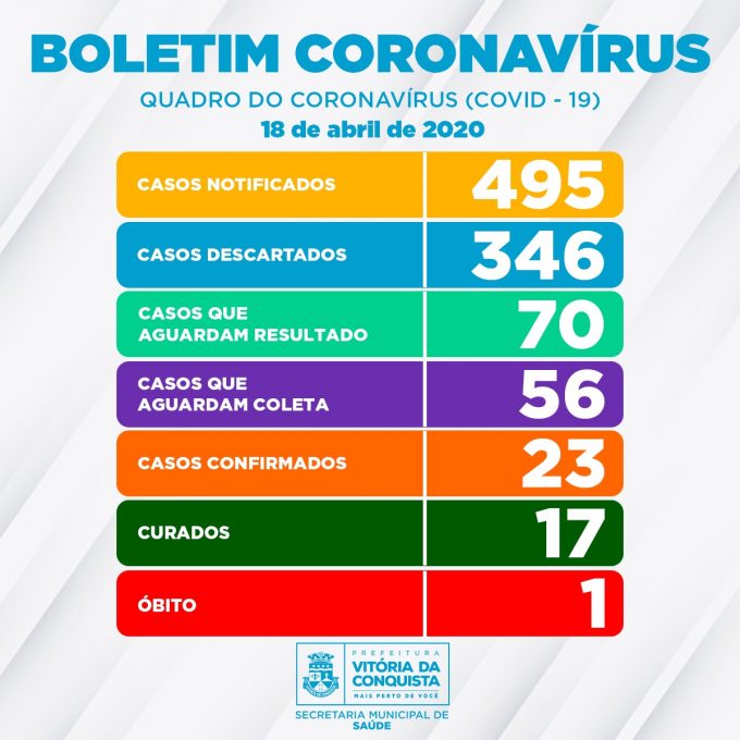 Até às 17h de hoje, já foram registrados no município 495 casos notificados com suspeita clínica e epidemiológica da infecção pelo novo coronavírus. 346 casos foram descartados e 126 estão em investigação, sendo que 70 aguardam resultado laboratorial e 56 aguardam coleta de amostras para serem enviadas ao Lacen Estadual, em Salvador, onde é feita a análise por meio de biologia molecular.