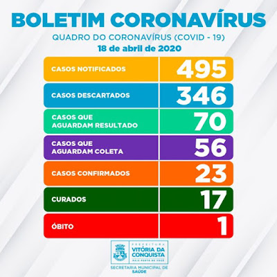 No ultimo registro, que aconteceu no sábado (18), abril, mais 3 casos tiveram resultados positivos para infecção pela Covid-19, totalizando 23 casos confirmados em Vitória da Conquista.
